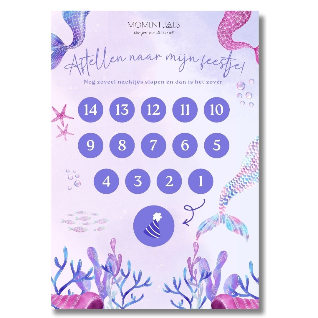 De aftelkalender past perfect bij de bijbehorende Zeemeermin Uitnodiging, zodat alles één mooi geheel vormt. Print de kalender thuis uit en hang hem op een leuke plek in huis – elke dag een vakje afstrepen maakt het feest nóg specialer en zorgt voor een verbindend moment samen met je kind.