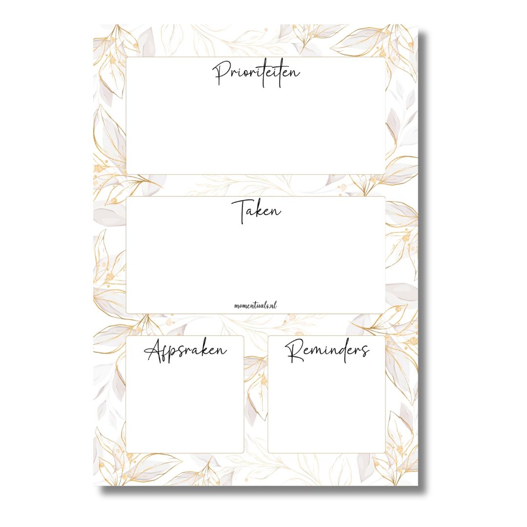 - Overzichtelijke Indeling: Met aparte secties voor prioriteiten, taken, afspraken en reminders kun je je dag effectief organiseren en niets vergeten.